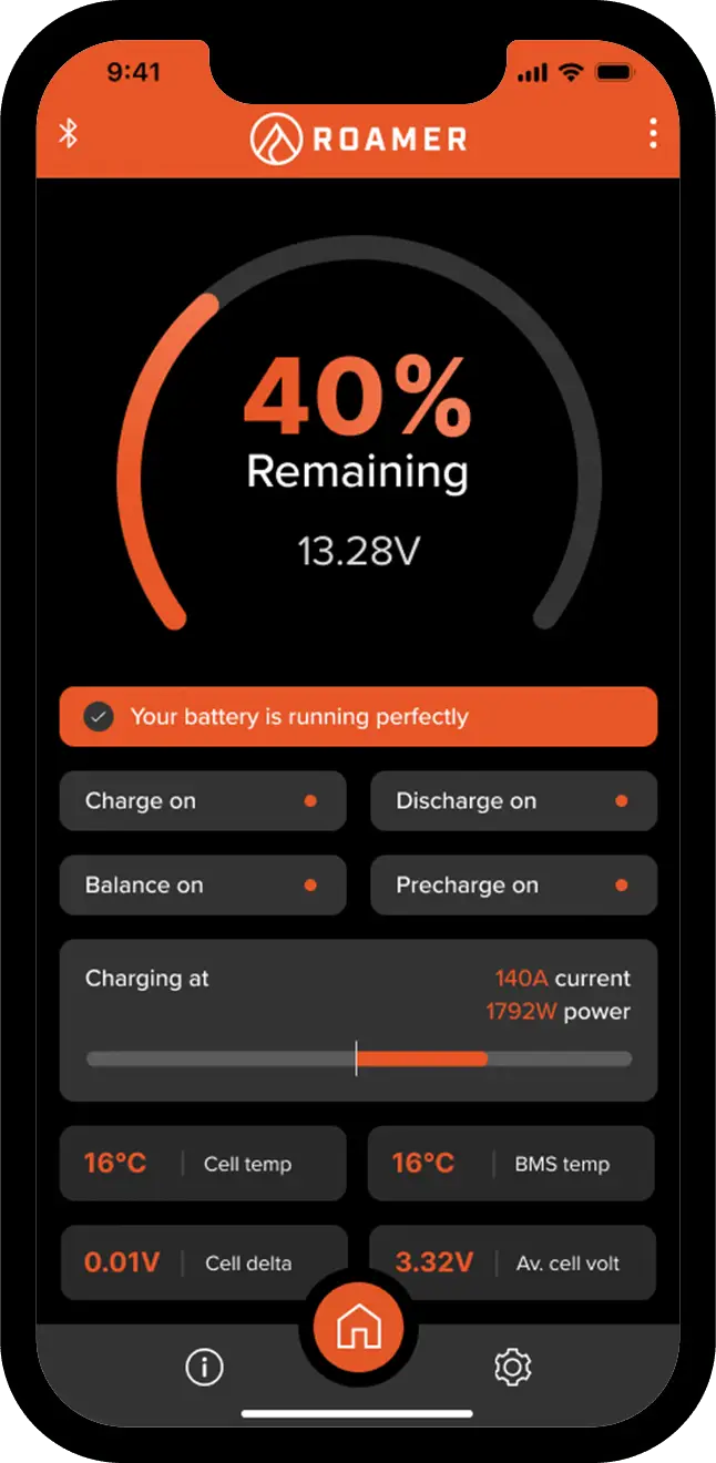 Whoever said knowledge is power has obviously encountered the Roamer SMART app. Whether you’re on the road, on the water or up a mountain, you will always know the state of play with your Roamer battery. One quick glance will tell you everything you need for on-the-spot decisions – should you pull up for the night or roll on to your final destination?