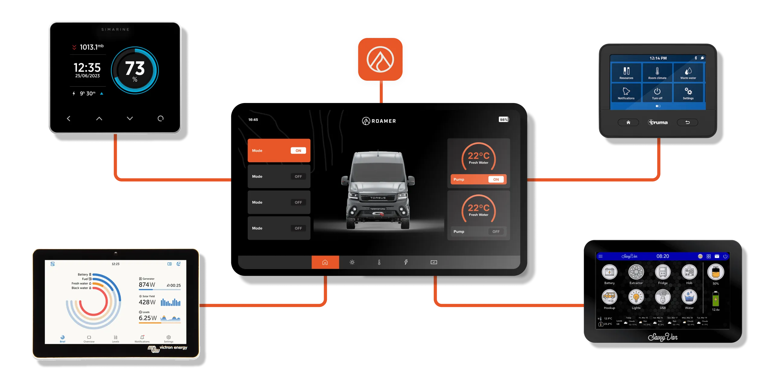 Roamer offer simple integration with a wide range of compatible inverters and touchscreen monitoring systems. We pair natively with Victron GX, Garmin, Simarine, SavvyVan, Truma and BCA, and can also communicate with any BMS.CAN, NMEA2000 (Raymarine, Simrad etc) or CI-Bus compatible screen.